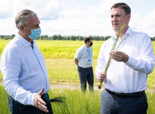 В рамках визита федеральный министр побывал на предприятии ООО «Брянский лен». Он оценил поля, где выращивают лен и завод по его переработке.