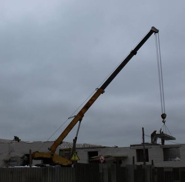Строители укладывают плиты перекрытия на уровне второго этажа. Работа движется быстро, так как все подъездные пути и инженерные коммуникации подведены заранее.