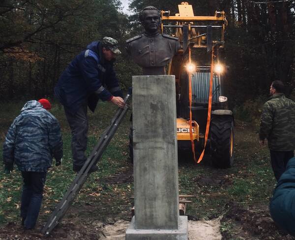 Финансовую поддержку в установке памятника под Трубчевском оказала известная корпорация «Ростех». Откликнулось и Брянское землячество в Москве: оно курировало работы по созданию бюста, изготовлением которого занялся скульптор, член Союза художников О. М. Шмыров – уроженец Брянска.