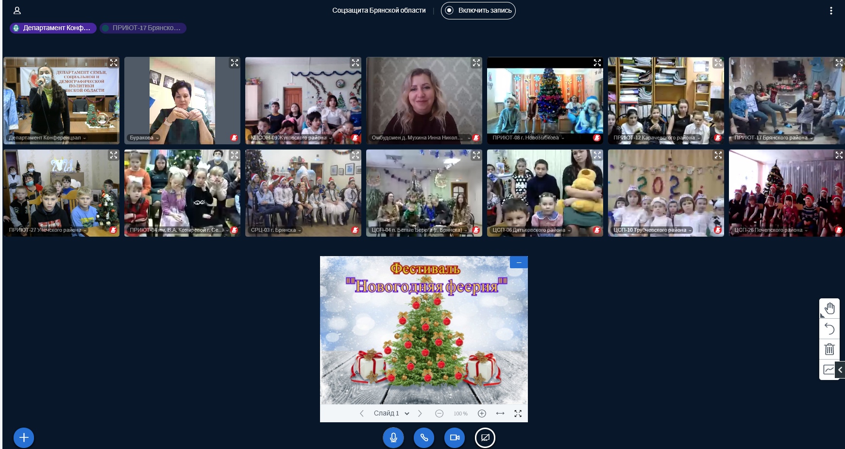 Для воспитанников специализированных учреждений для несовершеннолетних Брянской области состоялся фестиваль «Новогодняя феерия». Он прошел 25 декабря в режиме видеосвязи. Ребят поздравили депутат госдумы Валентина Миронова, уполномоченный по правам ребёнка в Брянской области Инна Мухина, замдиректора департамента семьи, социальной и демографической политики Брянской области Наталья Ковалевская. А также их поздравили Дед Мороз и Снегурочка и передали детям новогодние подарки.