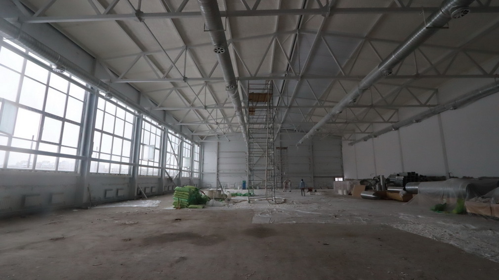 В здании монтируется вентиляция, идут сантехнические работы. Чтобы снизить гулкость и уровень шума, в спортзале идут работы по акустическому напылению потолка.