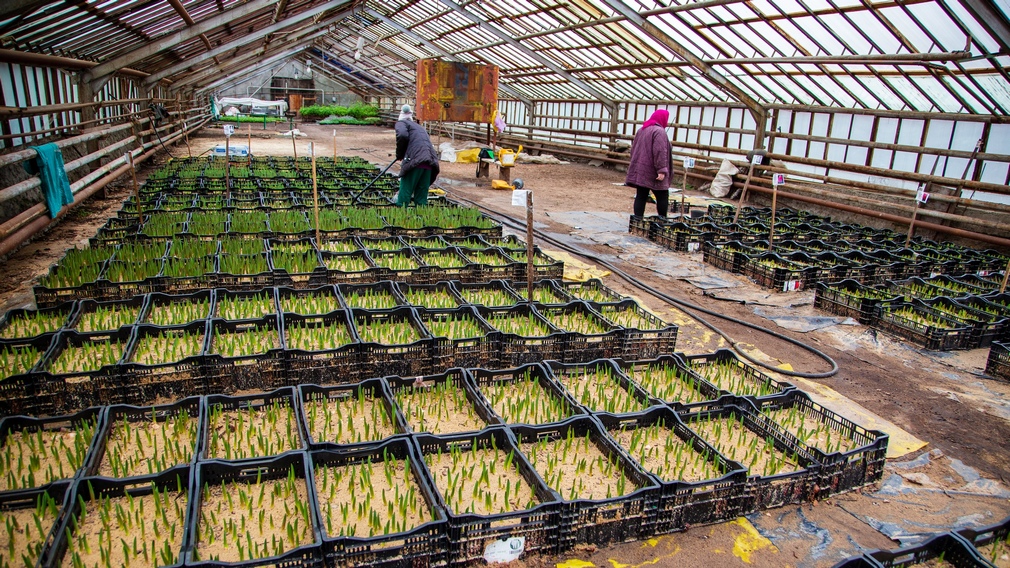 К марту нежные зеленые росточки превратятся в разноцветный ковер цветов. Всего сотрудники тепличного хозяйства высадили 15 сортов тюльпанов. Скоро в теплицах увеличат температуру, и ростки пойдут в бурный рост.