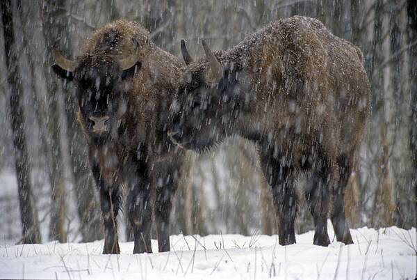 В заповеднике «Брянский лес» сфотографировали зубров. Они гуляли во время метели.