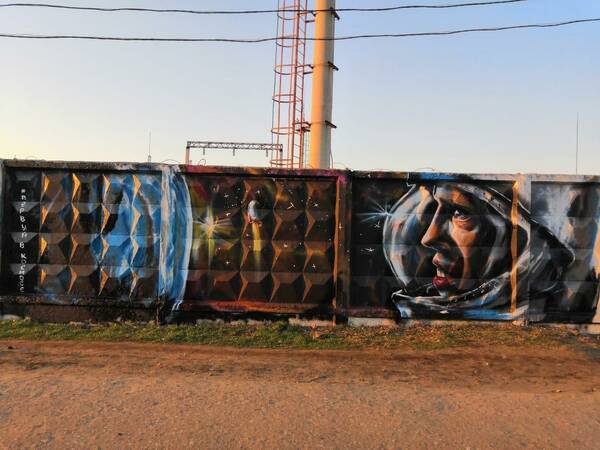 Данное граффити с первым космонавтом появилось в Фокинском районе Брянска. Арт-площадка «Мой космос» была создана на бетонном заборе около железной дороги.