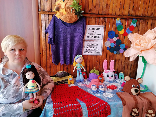 Для детей Светлана вяжет забавные, очаровательные игрушки: куклы, зайчики, белочки, танки, кукольные театры, героев компьютерных игр и новогодние карнавальные костюмы, а также более практичные вещи — варежки, шапочки, шарфы, беретки, шали и т.д. В доме много связано и пошито своими руками, в том числе вязаные шторы на кухне. Она рассказала, что любит шить, работать крючком и со спицами. Но большую радость доставляет работа крючком, ведь эти изделия не только красивы и уникальны, они позволяют каждому мастеру проявить свой вкус и фантазию, разнообразие приемов вязания, нестандартность фасонов. Для Светланы главное – видеть результат своего труда, чтобы красота, созданная своими руками, радовала родных и близких.