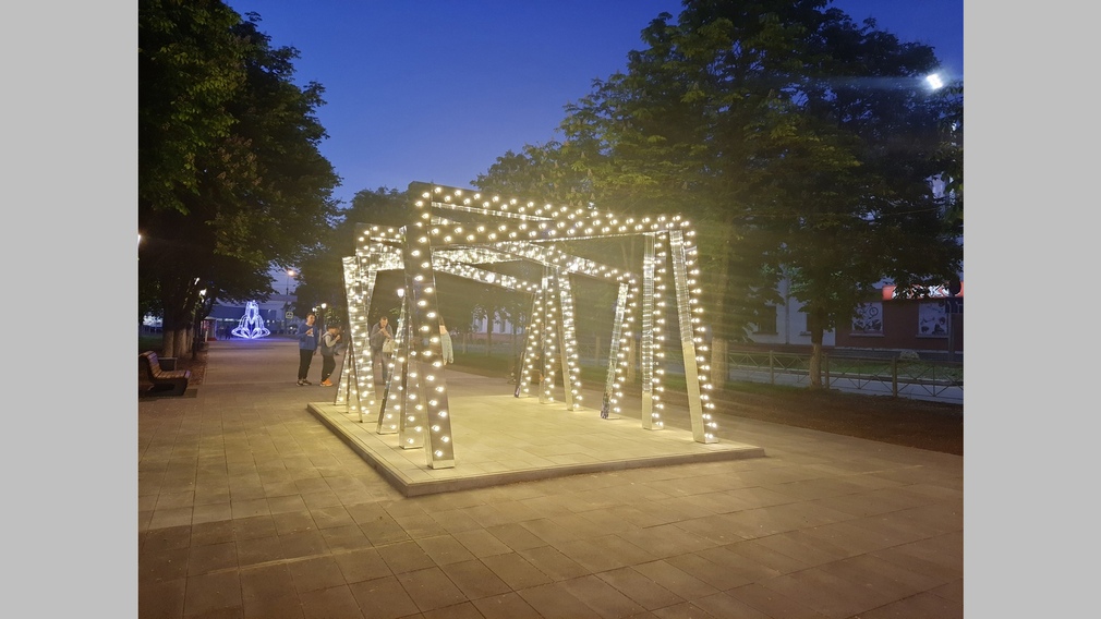 В обновленном сквере установили световой тоннель из шести арок с тысячей лампочек. Элементы освещения мощностью всего по 1 ватту создают визуальный декоративный свет, поэтому не предназначены для бытового использования.