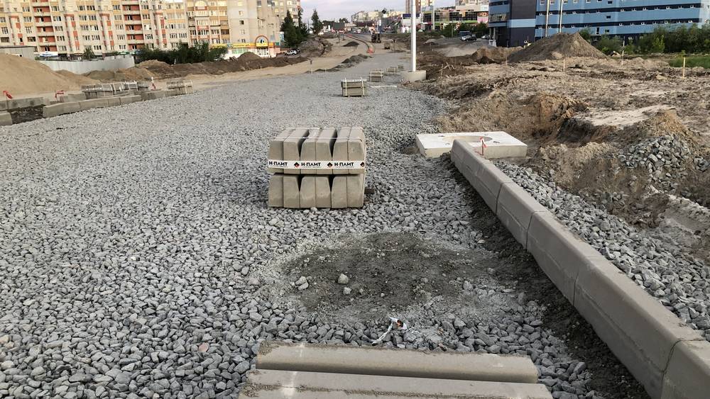 Почти по всей длине ремонтируемого участка подготовили основание для асфальтирования. За счет расширения выправили линию дороги около оврага. Границу дороги за светофором сдвинули в сторону домов. Теперь на перекрестке не будет бутылочного горла.