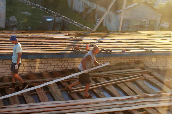 Бригада подрядчика начинает работу в 4 утра, чтобы успеть сделать основные работы до наступления 30-градусной жары. По условиям контракта крыша должна быть готова через 2 недели.