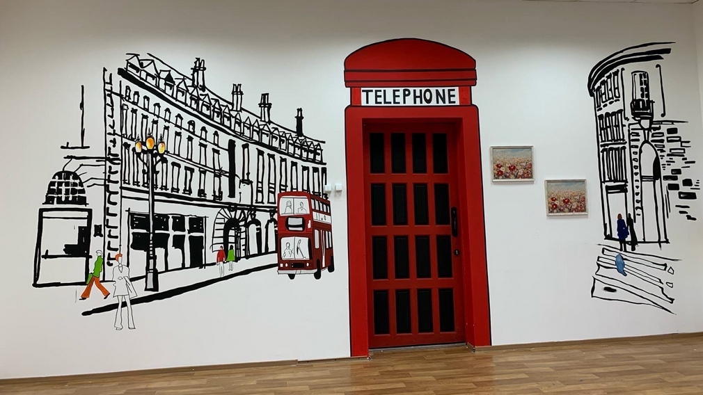 Стены помещения украшены современными графичными изображениями улочек мировых столиц. Здесь можно увидеть Эйфелеву и Пизанскую башни, двухэтажный лондонский автобус, Биг-Бен и современные здания Москва-сити. Дверь аудитории стилизована под вход в телефонную будку, а в одном из углов нарисован старинный фонарь.