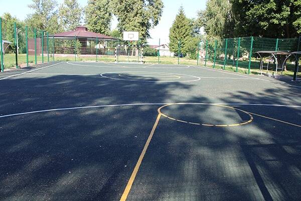 Работы проводились подрядчиком ИП Сушков Н.А. в рамках муниципальной программы «Формирование современной городской среды на 2018-2024 годы». На площадке выполнены работы по устройству водонепроницаемого покрытия из резиновой крошки, установлены ограждения из металлических решетчатых панелей, ворота, баскетбольные кольца, скамейки.