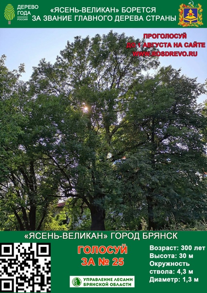 Ясень-великан из Брянска участвует под номером 25. Все брянцы, которые еще не голосовали, могут это сделать, и помочь победить дереву с родной земли. Для этого нужно зайти на страницу проекта «Деревья – памятники живой природы» по адресу https://rosdrevo.ru/russian-tree-of-the-year/ .