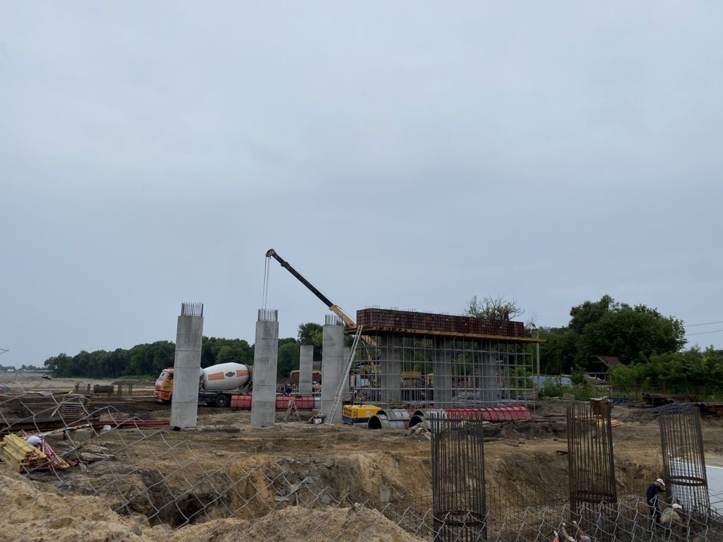Заливка первого ригеля — одного из основных и важных элементов переправы. Это своеобразная несущая конструкция, поперечная балка, которая будет удерживать пролет моста. Всего их 48. Ведутся работы и в русле реки — это один из самых трудоёмких и сложных процессов. Уже скоро сюда будет доставлена сваебойная машина, которая установит оставшиеся сваи в дно реки. Достойно встретили мостостроители и первый паводок, как признаются они сами, всё было организовано и прошло без ущерба для стройки.
