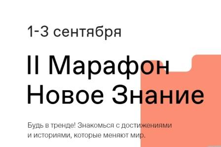 С 1 по 3 сентября пройдет II федеральный Просветительский марафон «Новое Знание», приуроченный ко Дню знаний. Организатором выступает Российское общество «Знание». В роли лекторов и наставников — свыше 150 выдающихся российских и зарубежных ученых, государственных и общественных деятелей, а также звезды мировой культуры и спорта, историки, изобретатели, публицисты и успешные предприниматели.