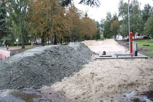 Бригада подрядчика демонтировала старое асфальтированное покрытие и садовые скамейки, установила бордюрные ограждения. Сейчас они готовят площадь к укладке тротуарной плиткой, завезены песок и другие стройматериалы.