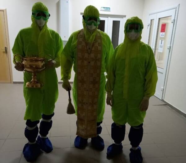 В защитном костюме протоиерей Петр освятил все кабинеты и палаты госпиталя, реанимацию, приемный покой. Всем сотрудникам батюшка пожелал крепости сил, а больным – скорейшего выздоровления.