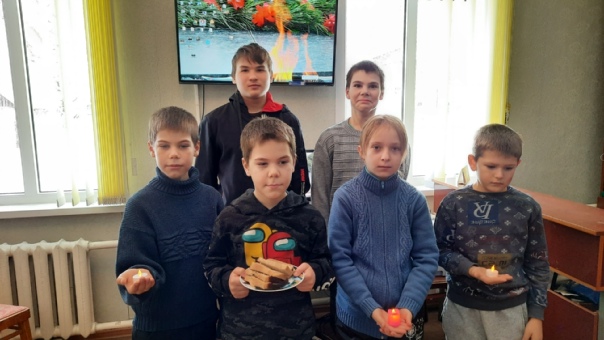 Ребята затаив дыхание, слушали рассказ библиотекаря о тяжёлых испытаниях, выпавших на долю жителей города, о блокадном хлебе, символе памяти – 125 граммов чёрного хлеба, о судьбе Ленинградки Тани Савичевой, которая пережила ужасы блокады, смерть близких, о её дневнике, как умирали её родные. Ребята узнали о «Дороге жизни» через Ладогу, и что всё это длилось — 872 дня.