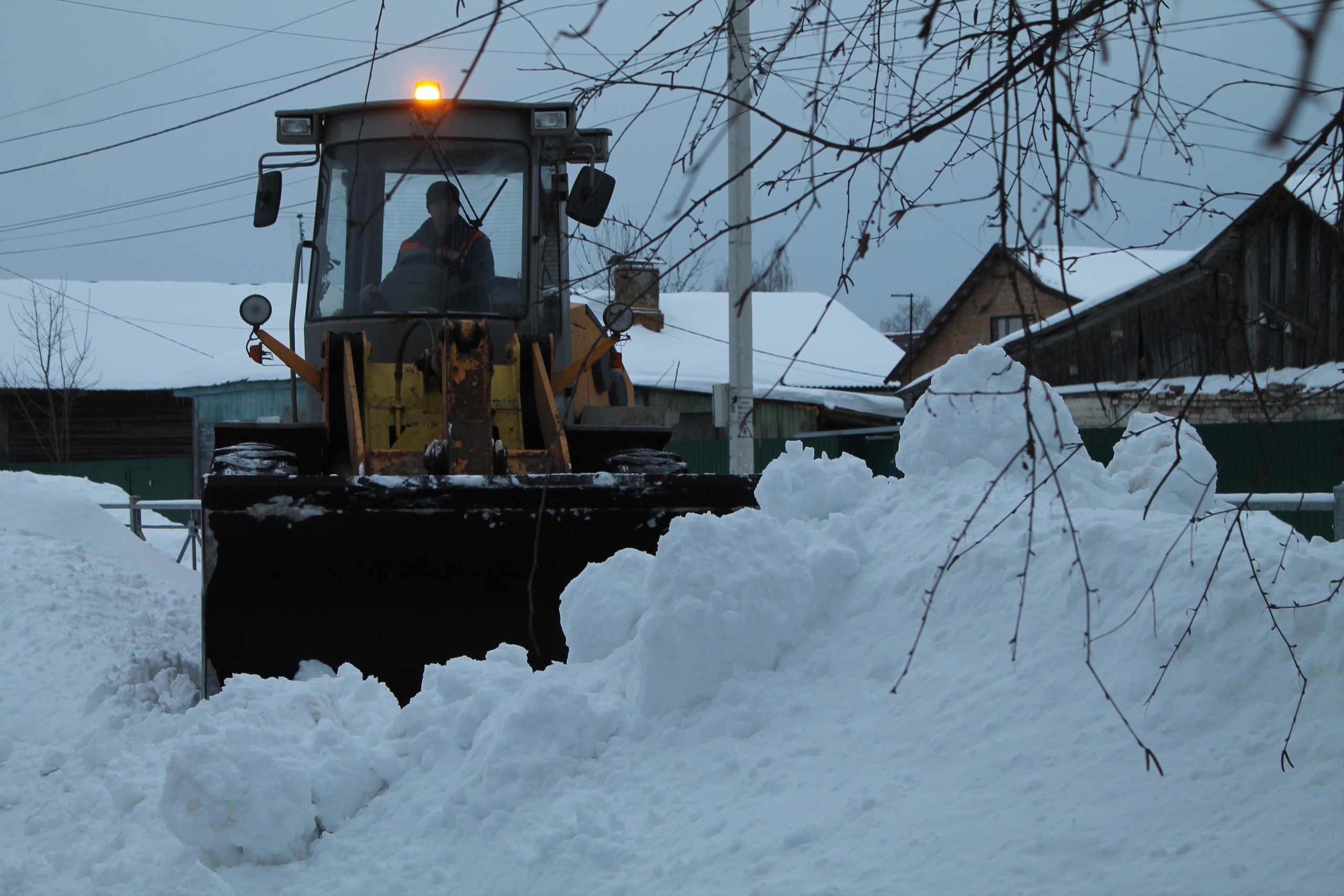 В данный момент идет расчистка улицы 50 лет Октября. Убираются снеговые заторы по бокам проезда, расширяется дорожное полотно.