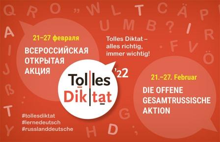 С 21 по 27 февраля 2022 года в 10-й раз пройдет Всероссийская открытая акция «Tolles Diktat» по инициативе общественных организаций российских немцев с целью популяризации немецкого языка и развития культуры грамотного письма на немецком языке. Принять участие в акции может бесплатно любой желающий.