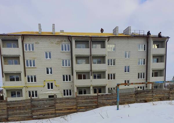 Укладывается металлочерепица на крышу, и ведется монтаж газового оборудования по всему дому.В доме 4 этажа. Он предназначен для малоимущих и детей-сирот.