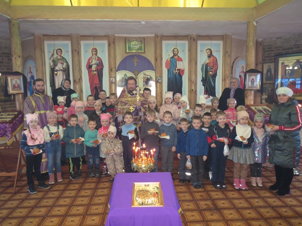 В этот день, помимо прихожан, на богослужении присутствовали воспитанники подшефного детского сада «Аленький цветочек», находящегося по соседству с храмом. Детей сопровождали воспитатели и заведующая дошкольным учреждением О.В. Терехова.