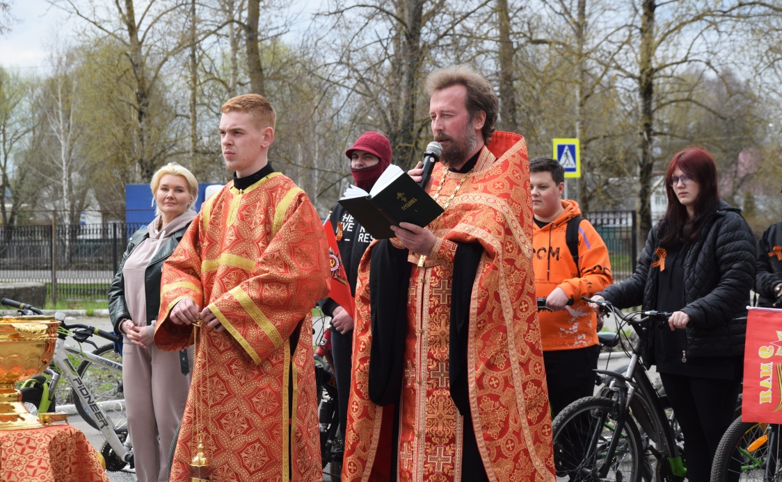 Почетное право открыть велопробег было предоставлено благочинному Карачевского церковного округа протоиерею Владимиру Сафронову. Священник совершил молебен о путешествующих, окропил участников святой водой и обратился с напутственным словом: «День Победы — это праздник, который невозможно забыть, ибо слава человеческого подвига во имя свободы родной земли не меркнет в веках. Наши деды и прадеды победили фашизм и оставили нам пример истинного мужества и любви к Родине. И сегодня мы посвящаем Победе свои силы, знания, свою благодарную память. Я желаю всем участникам сегодняшнего мероприятия силы духа, воли к новым свершениям на благо родной страны, помощи Божией на всех путях жизни! «.