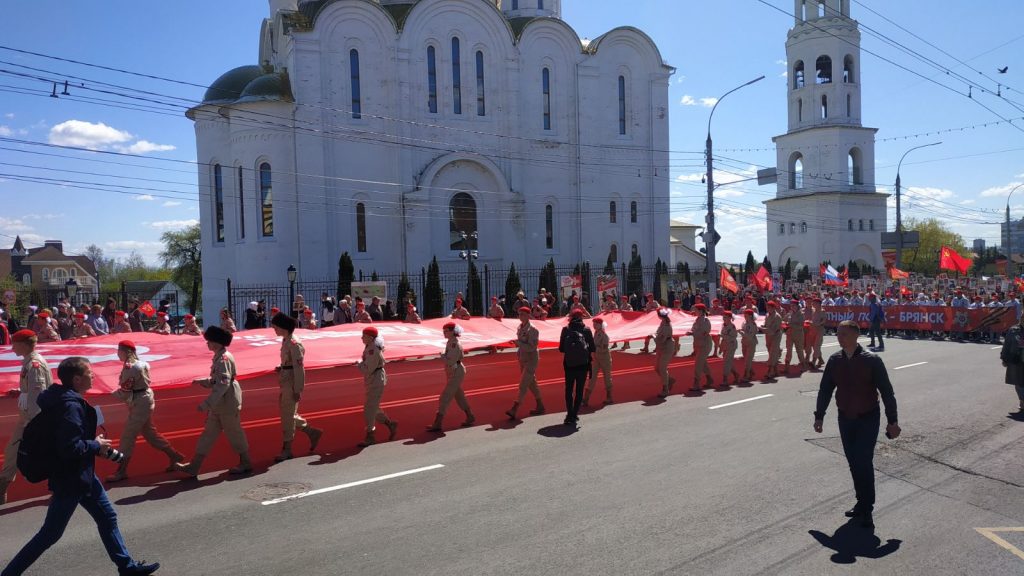 Колонна из порядка 60 тысяч брянцев, несущих в руках портреты своих героев Великой Отечественной войны, начала движение от стен кафедрального собора. Во главе — огромное полотнище копии Знамени Победы.