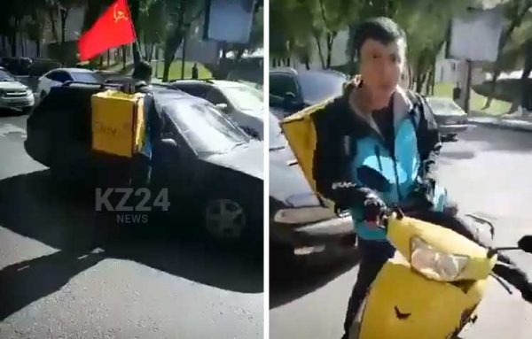 Тем, кто поленился смотреть ролик — его суть. 9 мая молодчик на скутере в форме всем известной компании доставки еды и с соответствующим рюкзачком перегораживает дорогу легковому авто с красным Знаменем Победы. Еще пара таких же лиц, гордо называющих себя гражданами Казахстана, срывает флаг и пытается его унести.
