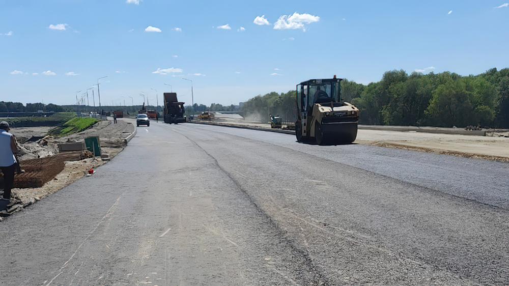 Подрядчик — «Орелдорстрой» — укладывает нижний слой асфальта на участке перед Славянским мостом.