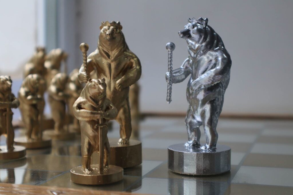 На доске игровые фигуры выстраиваются исключительно в образе медведя. Окрашены фигурки вместо привычных черного и белого цветов в золотой и стальной. Они символизируют душевное богатство русского народа и его твердость. Доска сделана с синей подсветкой. Этот цвет традиционно считается цветом веры, верности, честности.