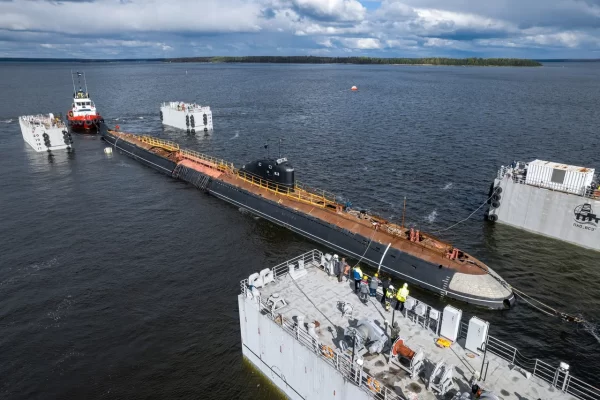 Работа по заводу лодки на баржу поистине ювелирная. Учитывая положительную плавучесть К-3, АПЛ потребовалось установить на расчетное место с максимальной погрешностью не более 150 мм. Сначала «Атлант» погрузился под воду, затем АПЛ была заведена и позиционирована точно над баржей.