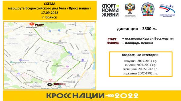 В этом году в Брянске пройдет «Кросс наций-2022». Как сообщает «БрянскToday», открытие и старт традиционно состоится 17 сентября на Кургане Бессмертия.