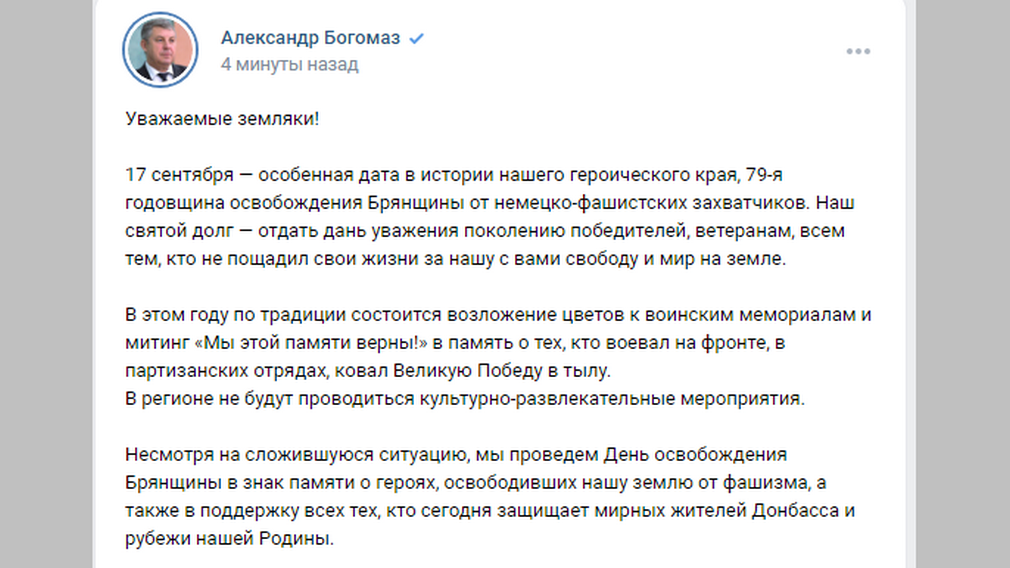 — В этом году по традиции состоится возложение цветов к воинским мемориалам и митинг «Мы этой памяти верны!» в память о тех, кто воевал на фронте, в партизанских отрядах, ковал Великую Победу в тылу. В Брянской области не будут проводиться культурно-развлекательные мероприятия, — написал Александр Богомаз.