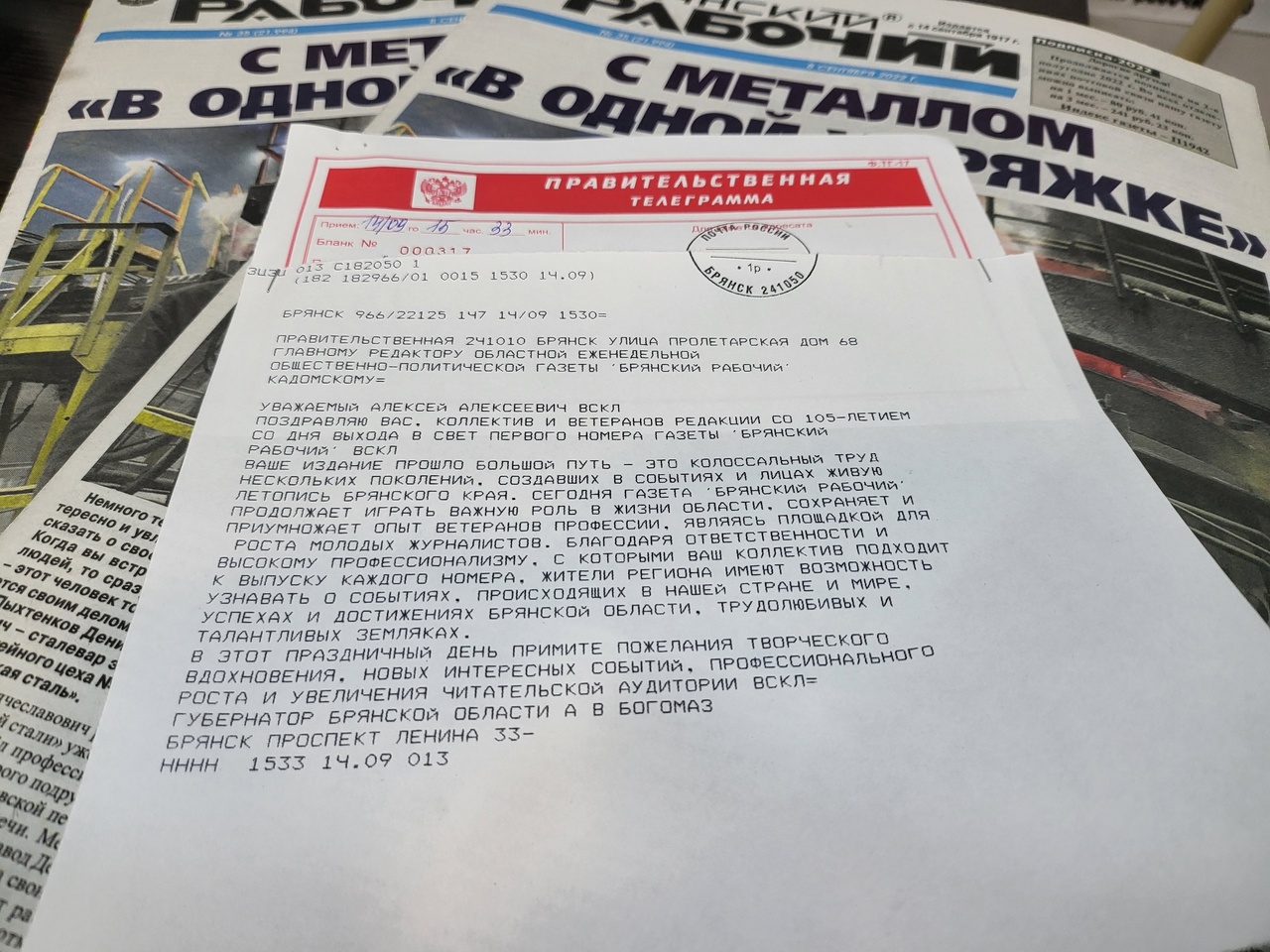«Уважаемый Алексей Алексеевич! Поздравляю Вас, коллектив и ветеранов редакции со 105-летием со дня выхода в свет первого номера газеты «Брянский рабочий»!