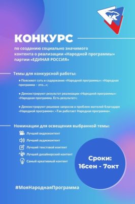 На данный конкурс можно отсылать видеоролики, аудиоконтент, текстовые материалы в разных жанрах, а также карточки, постеры, инфографику и фотоподборки. Отметим, что народная программа «Единой России» была принята 24 августа 2021 года на Съезде партии, с этой программой партия шла на выборы депутатов Госдумы. Она состоит из двух блоков и 14 тематических разделов. В ее основе – предложения и запросы граждан.