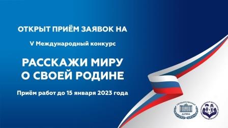 АНО «Инновационный центр развития и воспитания детей и молодёжи» совместно с Комитетом Государственной Думы по вопросам семьи, женщин и детей объявили о старте пятого Международного конкурса «Расскажи миру о своей Родине» и приглашают всех желающих к участию.