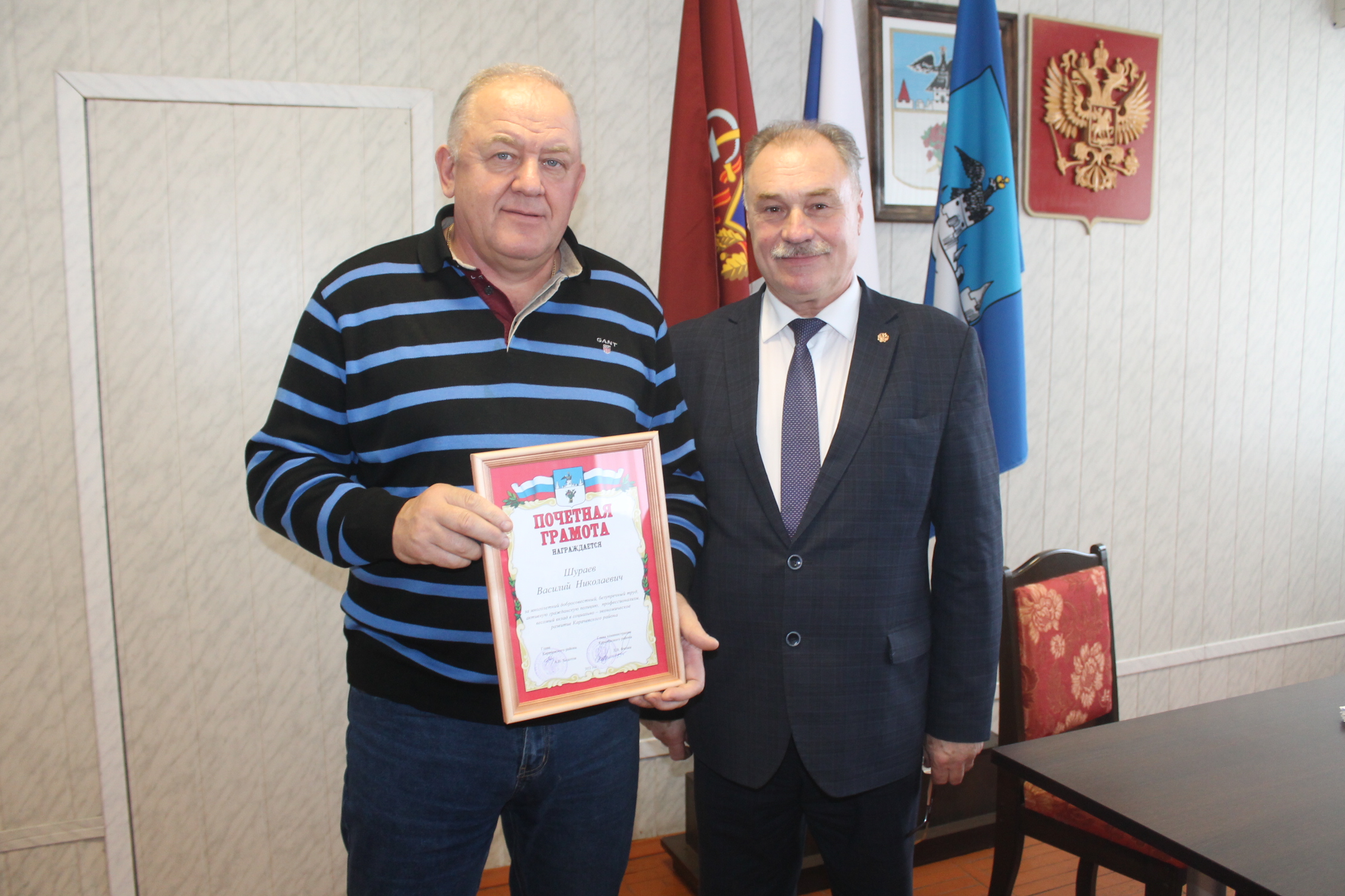 Леонид Васильевич Филин вручил Почетную грамоту директору ООО «Веза» Василию Николаевичу Шураеву. Предприятие достигло достойных экономических показателей, дало району новых 150 рабочих мест, регулярно участвует в различных благотворительных акциях.
