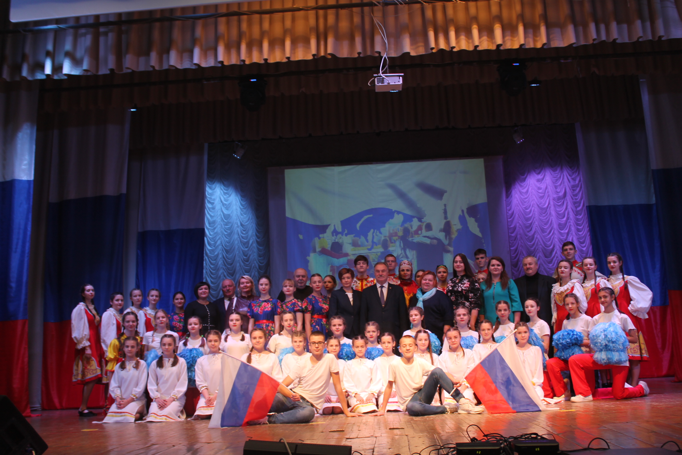 В оформлении сцены преобладал триколор: синий, белый, красный. Красочно, ярко, в то же время торжественно. И на этом фоне как-то особенно гармонично звучали слова поздравления с праздником.