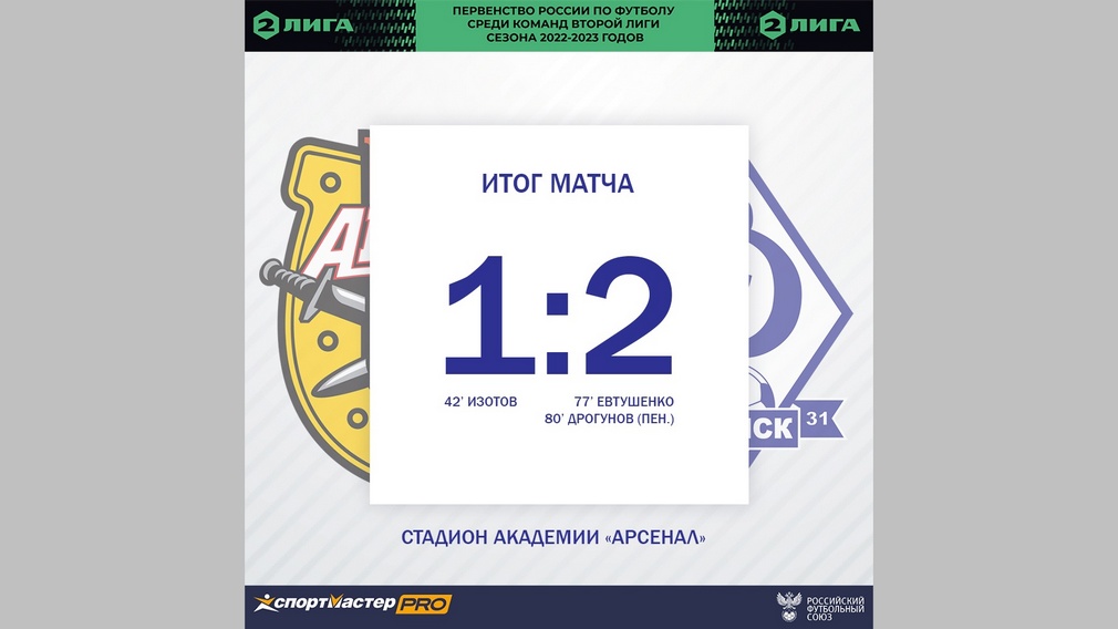 Решающие голы в ворота соперника забил Евтушенко и Дрогунов. Об этом сообщила РИА»Стрела» со ссылкой на социальные сети «Вконтакте» на официальной странице футбольного клуба.