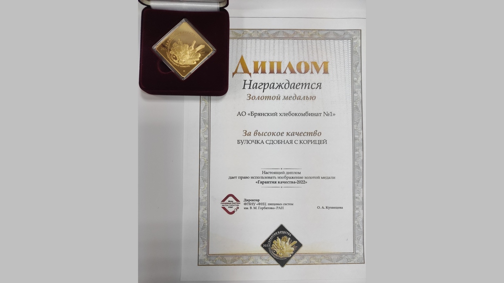 РИА»Стрела» сообщила, что брянский хлебокомбинат №1 получил очередную награду. В этот раз — приз Международного конкурса качества пищевой продукции «Гарантия качества — 2022». Хлебокомбинат был отмечен «Золотой медалью» за изделие «Булочка сдобная с корицей».