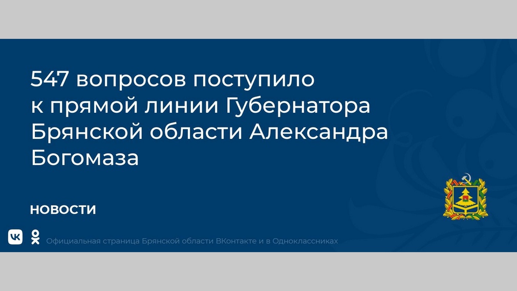 547 вопросов в Брянской области поступило к «Прямой линии» Губернатора Александра Богомаза. Самые активные остаются жители Брянска — 71 % обращений. На втором месте по активности – Клинцы и Брянский район. Жители этих территорий направили по 3 % обращений.