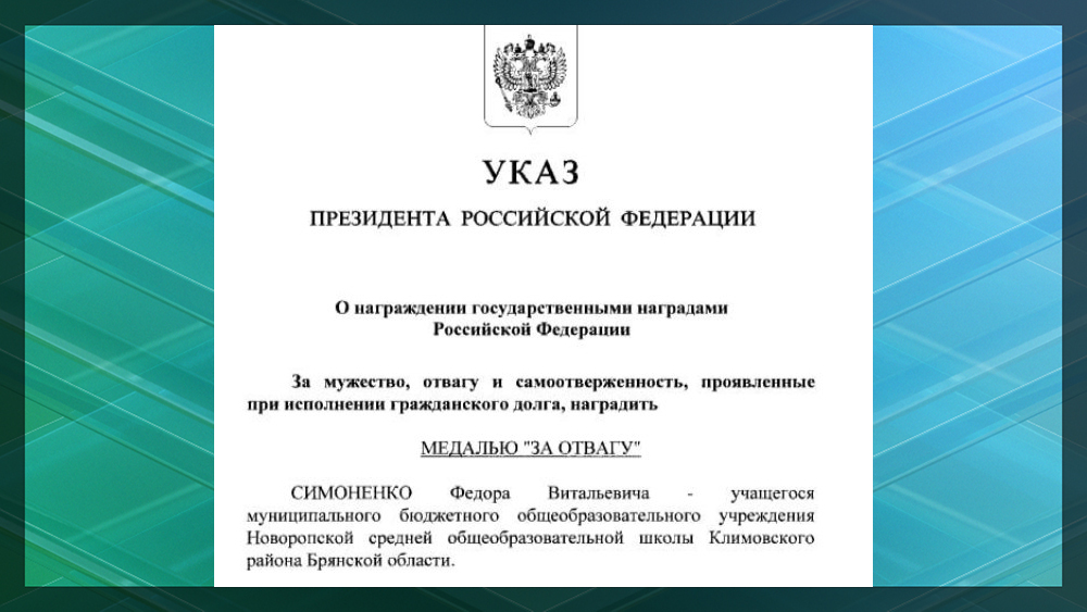 «За мужество, отвагу и самоотверженность, проявленные при исполнении гражданского долга, наградить медалью «За отвагу» Симоненко Федора Витальевича — учащегося муниципального бюджетного общеобразовательного учреждения Новоропской средней общеобразовательной школы Климовского района Брянской области», — говорится в указе президента.