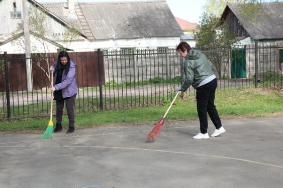 За чистотой территории школы постоянно следят ученики, которые приучены не сорить, а потому она изначально чистая. Педагоги для идеального её состояния наводят на ней последние штрихи.
