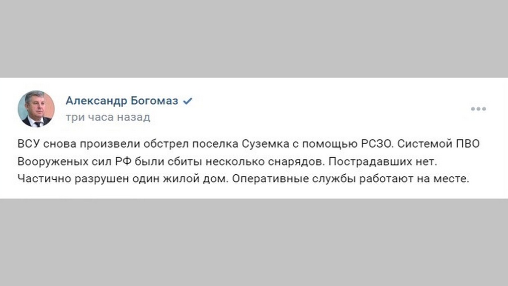 РИА «Стрела» со ссылкой на телеграм-канал губернатора Александра Богомаза сообщила, что сегодня утром ВСУ вновь произвели обстрел поселка Суземка. Укронацисты использовали ракетные системы залпового огня. Системой ПВО ВС РФ были сбиты несколько снарядов.