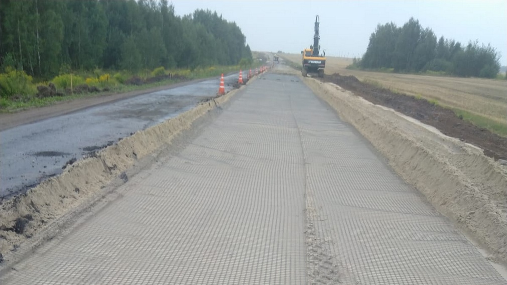 Подрядчик «Брянскавтодор» с применением георешетки обустраивает щебеночное покрытие, его толщина составит 24 см. Кроме того, выполняется нижний слой асфальтобетонного покрытия автодороги.