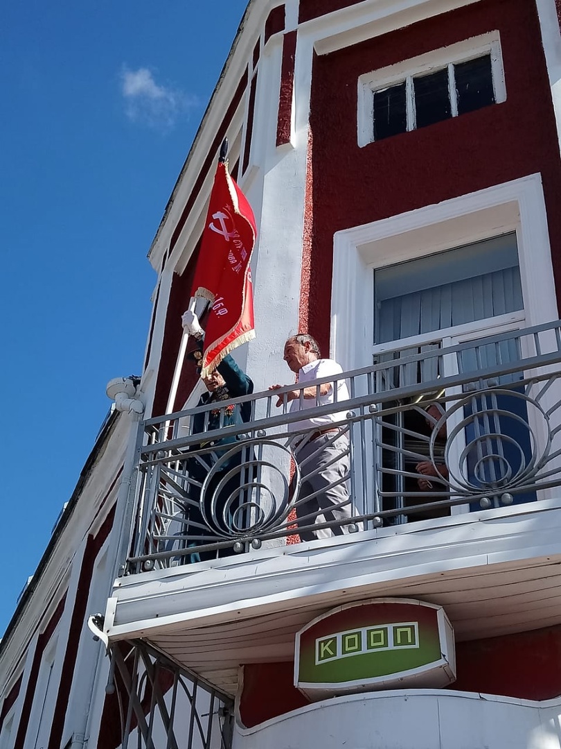 Почетное право водружения копии Знамени Победы на здании центрального универмага было предоставлено Заслуженному учителю РФ, почетному гражданину г.Карачева С.Д.Гаврилову и майору запаса, члену районной ветеранской организации Вооруженных Сил Ю.М.Петухову.