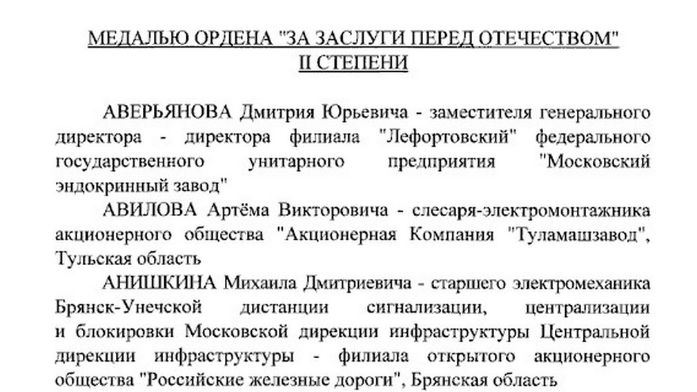 Президент РФ Владимир Путин подписал указ о награждении брянских железнодорожников. Брянцы медалью ордена «За заслуги перед Отечеством» II степени.