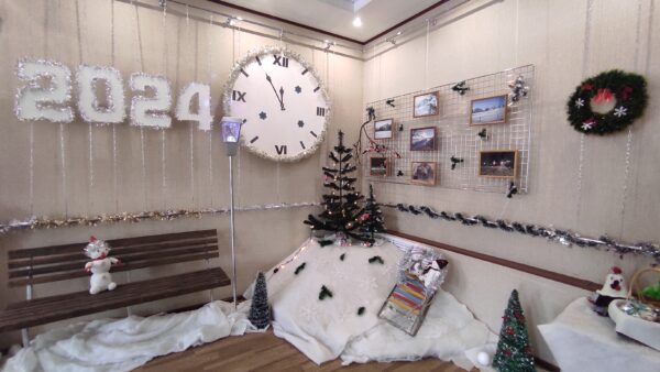 Начинать осматривать выставку можно с любой понравившейся ее части, но первой, несомненно, бросается в глаза зона, где в центре внимания — пушистая лесная красавица — новогодняя сосна, украшенная настоящими шишками, игрушками, разноцветным дождиком и сияющая новогодними огоньками. На макушке — звезда. Пожалуй, у каждой советской семьи, на каждой елочке «прошлого века» красовалась пятиконечными лучами такая алая звездочка. На стене у новогоднего дерева — часы-ходики, с притаившейся за резной дверцей кукушкой и стрелками, замершими за пять минут до наступления нового года. На столе, укрытом кружевной скатертью, советское шампанское, фрукты. Старинная деревянная этажерка хранит на своих полочках книги , сувениры, пузатый металлический будильник. Подчеркивает уютную атмосферу второй половины прошлого века и музыкальная радиола, бережно накрытая вышитой гладью салфеткой. На маленьком круглом столике телефон с блестящим диском. В век, когда не было ни Ватсапа, ни соцсетей, ни видеозвонков, ни Интернета, именно телефон, да еще почтовые открытки и письма были главными ниточками, связывающими между собой родных и близких, находящихся далеко друг от друга. Кстати, на стендах, размещенных на стенах зала, можно полюбоваться такими праздничными новогодними открытками. А еще на стенах — зимние пейзажи, вышитые крестиком картины зимушки-зимы, фотографии, поделки. Есть в зале и камин с дрожащими алыми всполохами огоньков-гирлянд на настоящих дровах, уютное кресло, а в противоположном конце — настоящий зимний дворик: горка, санки, огромный снеговик и даже красногрудые снегири, рассевшиеся на веточках дерева.