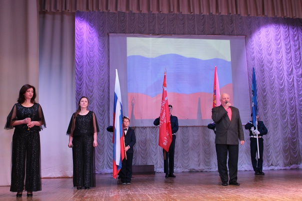 Под Гимн России в исполнении М.Морозова члены ДЮП школы № 4 торжественно внесли флаг Российской Федерации, Копию знамени Победы, флаги Брянской области и Карачевского района.