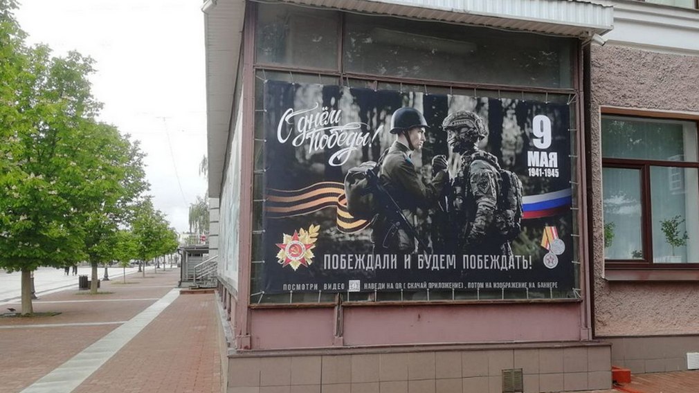 «С днём Победы! Побеждали и будем побеждать!» — гласит лозунг на патриотическом баннере.