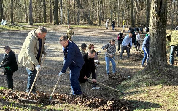 Так сотрудники регионального департамента строительства и управления капитального строительства наводят порядок в урочище Лесные Сарая. Тридцать человек очищают от старой травы, прошлогодней листвы и мусора часть территории, прилегающей к Судку, в том числе спортивную площадку.